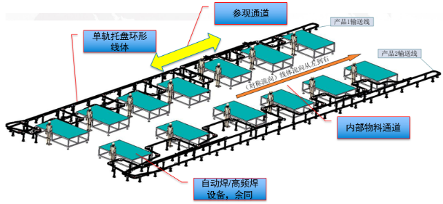 连续流输送输送线设计要求: 图3 线体结构效果图 2.1 线体结构:柔性单轨托盘输送线。 2.2 线体主要参数要求: